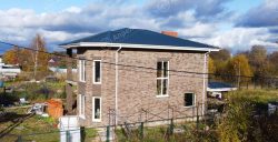 В этом доме 4 спальных комнаты, кухня, гостиная и 2 санузла. Капитальные стены из газобетонных блоков. Фасад дома из клинкерного кирпича с черным швом. Дом с эркером в гостиной и террасой на задний двор.